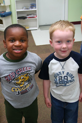 This little man standing next to Trey is Juston. When Trey began this preschool when he was just about 4, he was still a little nervous and would break out in tears on a weekly base. Juston would always try to make him feel better. Trey says the girls chase Juston and Trey around the playground.